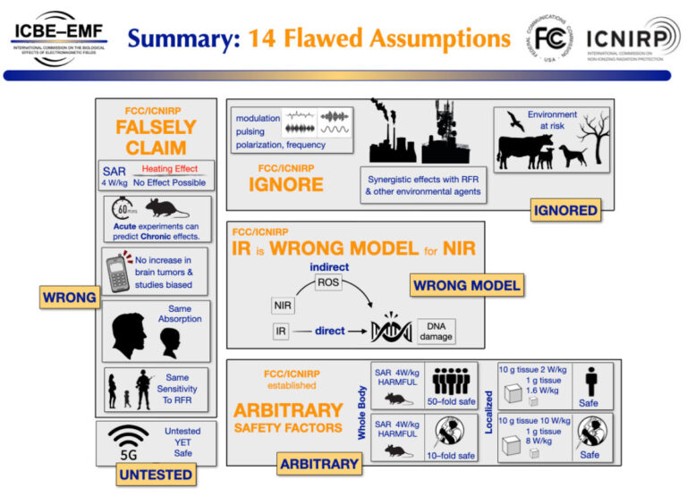 ICBE-EMF Infographic on the 14 flawed assumptions of the FCC and ICNIRP RF exposure limits. This image was developed to summarize the ICBE-EMF publication on how current FCC and ICNIRP limits are not protective for human health or the environment.